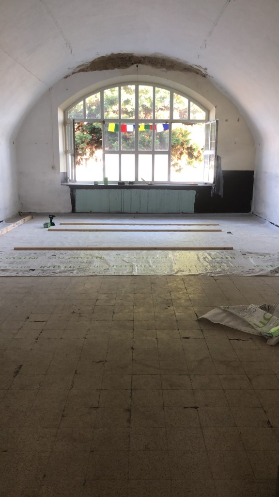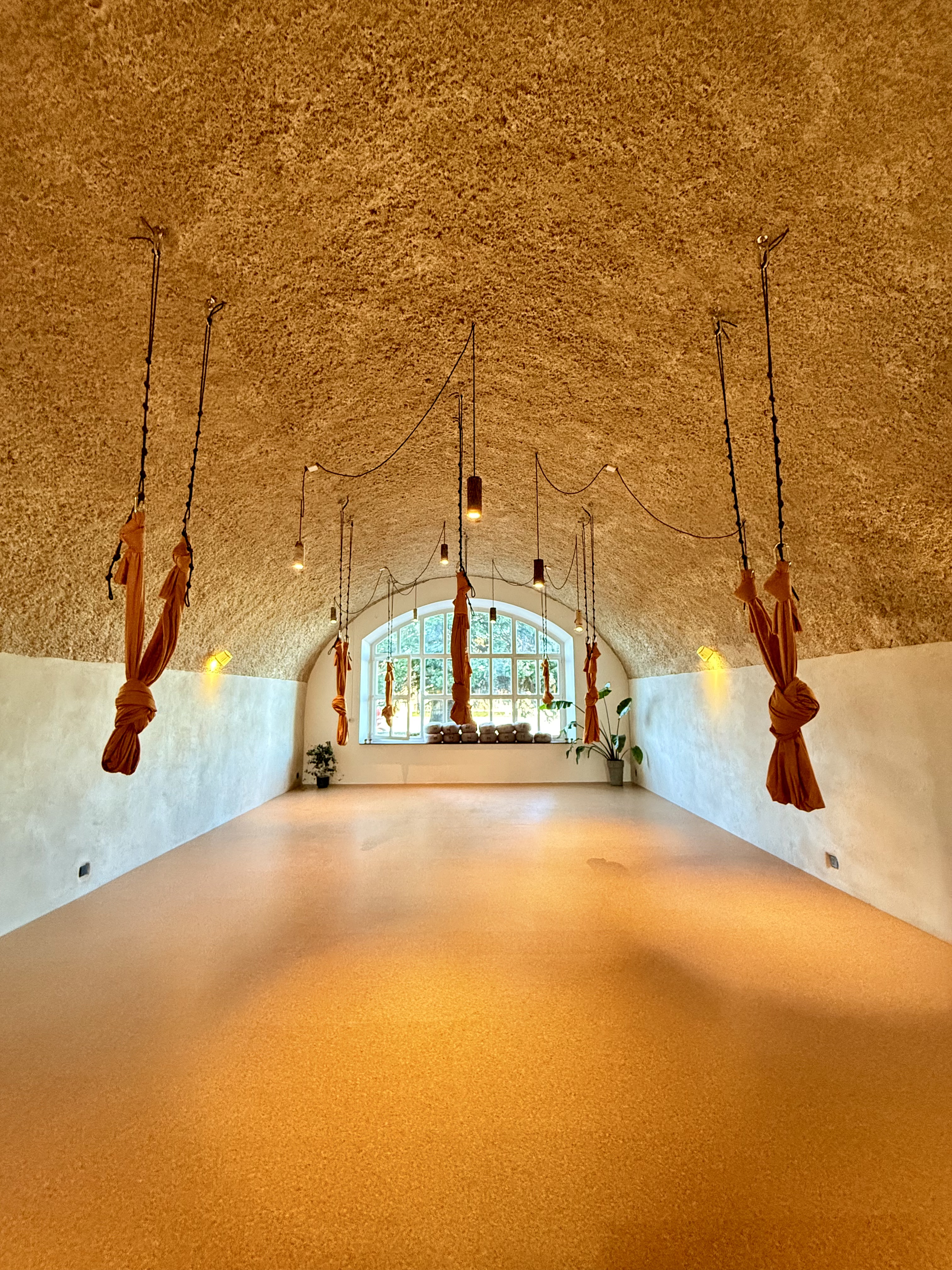 Aanwezig: 13 matjes, 13 kussens, 13 dekentjes, 8 aerial doeken (hangmat, zie foto), verwarming en akoestisch aangepast plafond met kalkhennep.