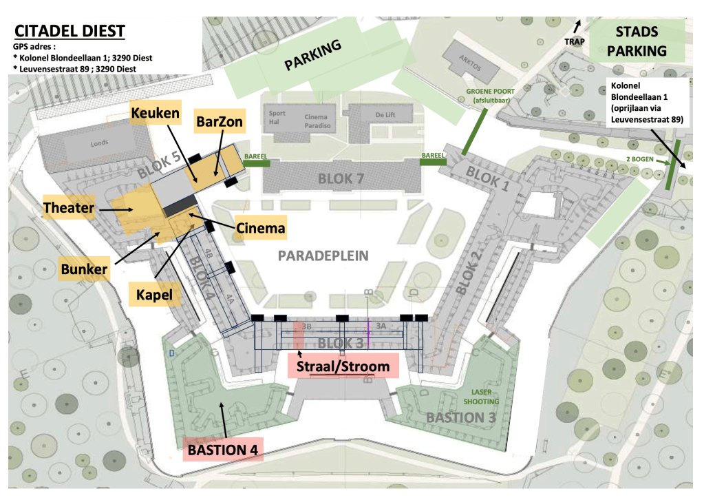 Rij de ‘Kolonel blondeellaan’ door tot je boven op de citadel aankomt. Rij door de groene poort en parkeer (als je met de wagen bent). Onze yogastudio is in blok 3, dus daarvoor moet je het grote plein volledig oversteken.